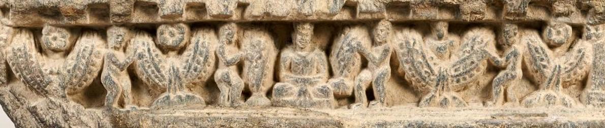 最下段には、ヘレニズム・ローマ起源の「花綱を担ぐ童子」が、釈尊の出家を賛嘆しています。